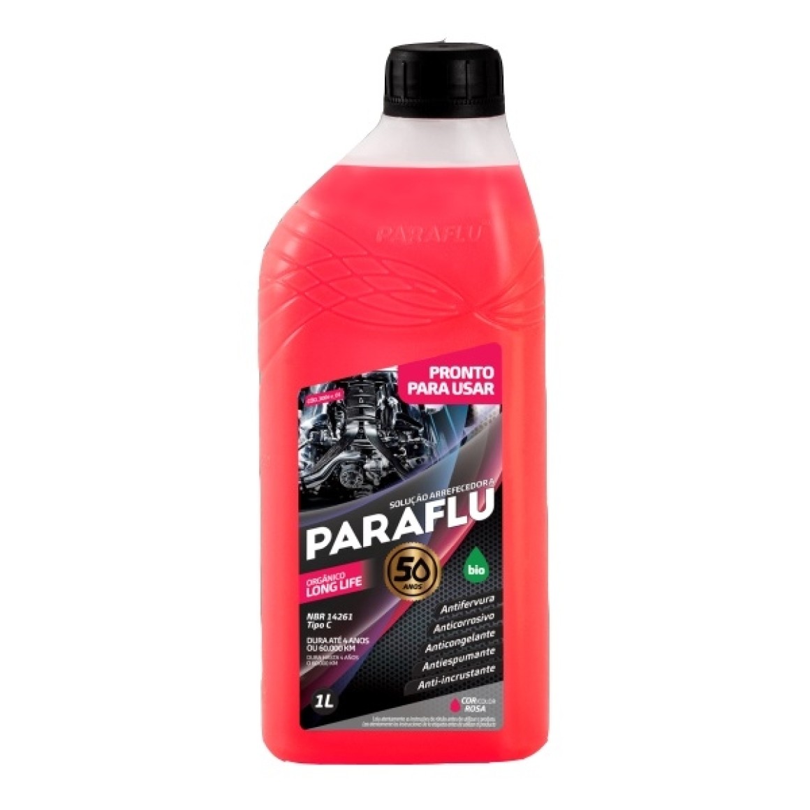 Paraflu Bio Orgânico possui a tecnologia Long Life OAT (Organic Acid Tecnology), que aumenta a vida útil do motor lubrificando a bomba d’água, a válvula termostática, evitando o ressecamento das mangueiras e protegendo contra a corrosão todos os tipos de motores. Sua formulação eleva o ponto de ebulição e reduz o ponto de congelamento, protegendo também contra o superaquecimento e o congelamento além de proteger contra a cavitação e não atacar os sensores eletrônicos. Possui propriedade antiespumante e anti-incrustante.